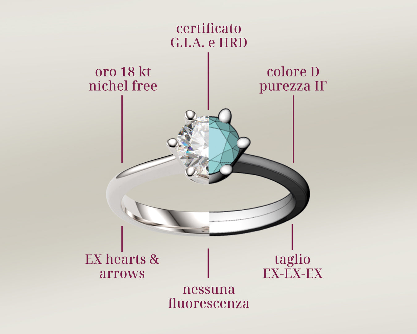 Ogni diamante è corredato da una certificazione emessa dai migliori istituti gemmologici riconosciuti a livello internazionale (G.I.A. e HRD) e a maggior tutela ha inciso al laser sulla cintura il numero di certificazione.
