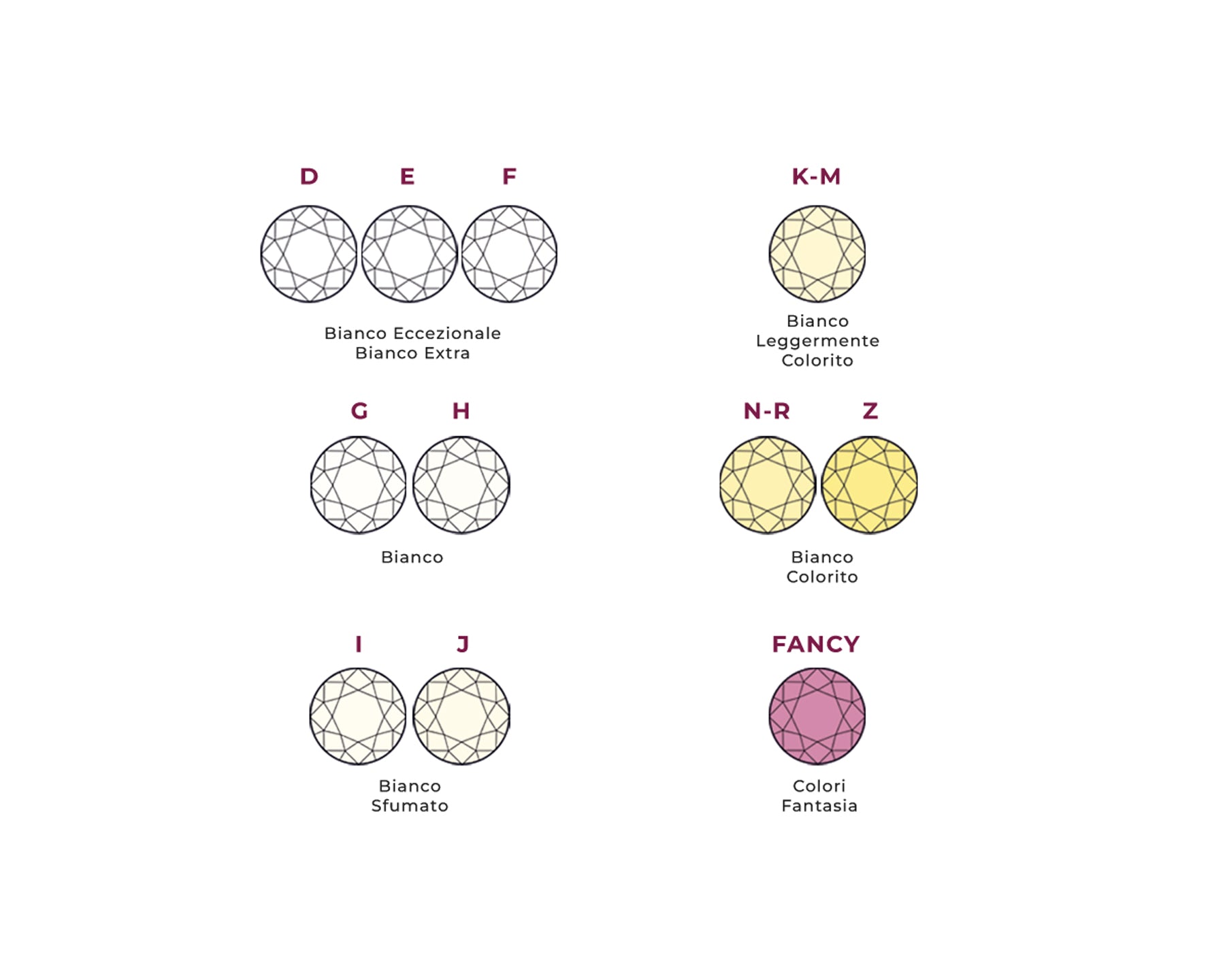 I colori dei diamanti sono classificati secondo una scala che da completamente incolore (D) va progressivamente colorandosi di una sfumatura gialla sempre più marcata (Z+).