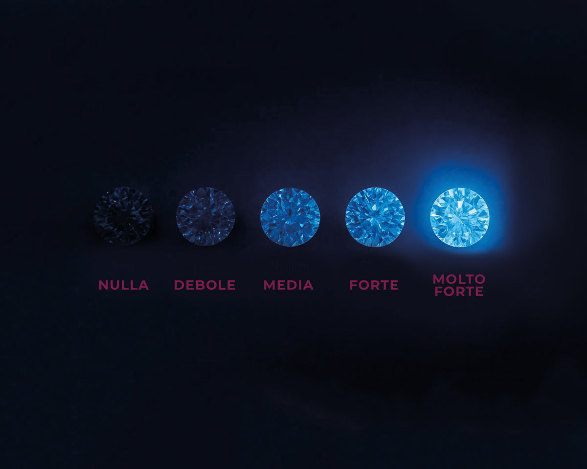 Il diamante di migliore qualità ha fluorescenza nulla, più forte è la fluorescenza più il valore del diamante diminuisce.